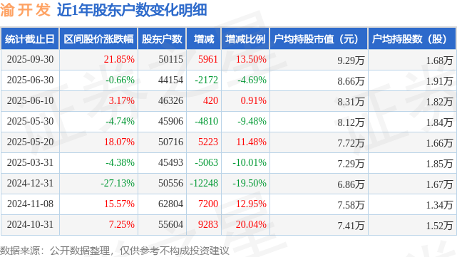 从股价来看,2025年6月30日至2025年9月30日,渝 开 发区间涨幅为21.85%,在此期间股东户数增加5961.0户,增幅为13.5%。