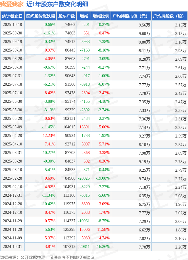 从股价来看,2025年9月30日至2025年10月10日,我爱我家区间跌幅为0.66%,在此期间股东户数减少201.0户,减幅为0.27%。