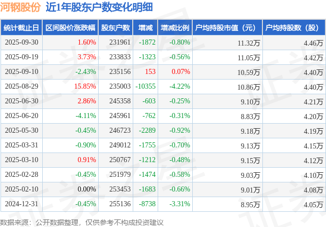 从股价来看,2025年9月19日至2025年9月30日,河钢股份区间涨幅为1.6%,在此期间股东户数减少1872.0户,减幅为0.8%。