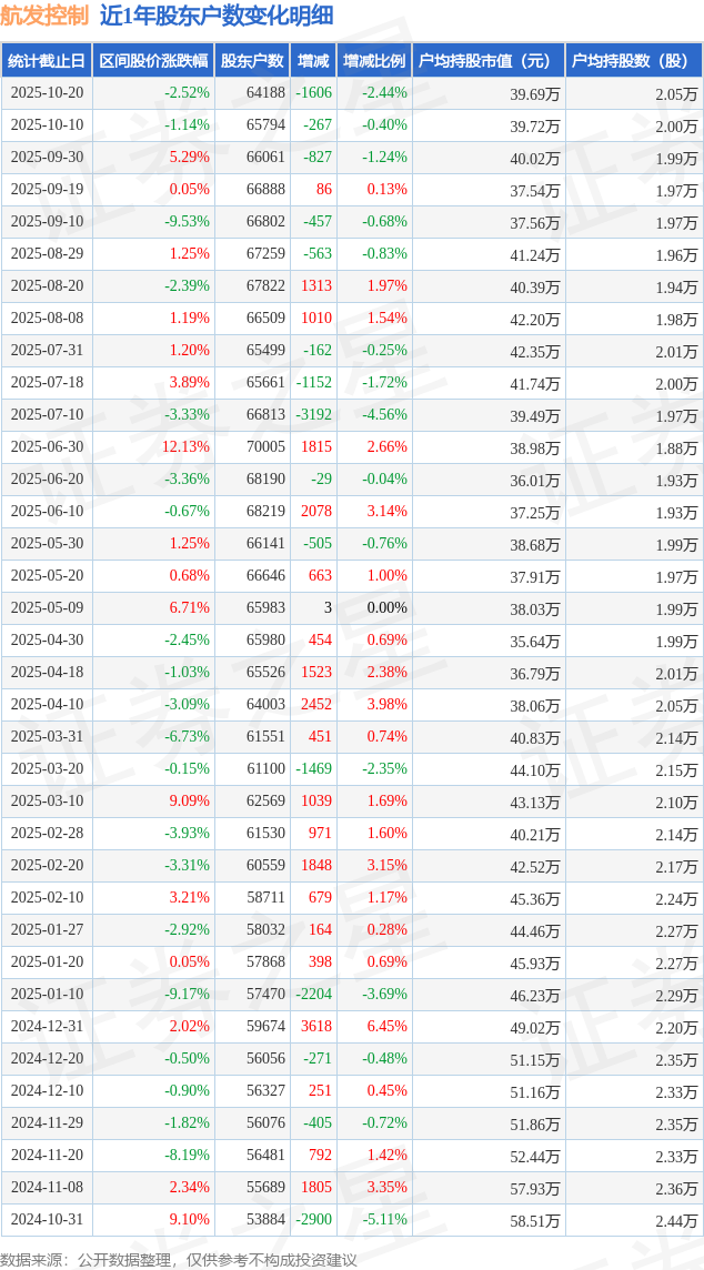 从股价来看,2025年10月10日至2025年10月20日,航发控制区间跌幅为2.52%,在此期间股东户数减少1606.0户,减幅为2.44%。