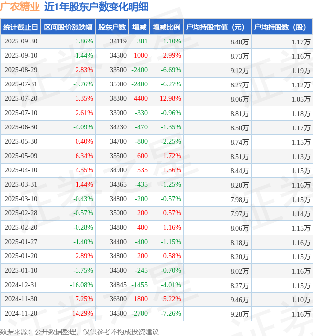从股价来看,2025年9月10日至2025年9月30日,广农糖业区间跌幅为3.86%,在此期间股东户数减少381.0户,减幅为1.1%。