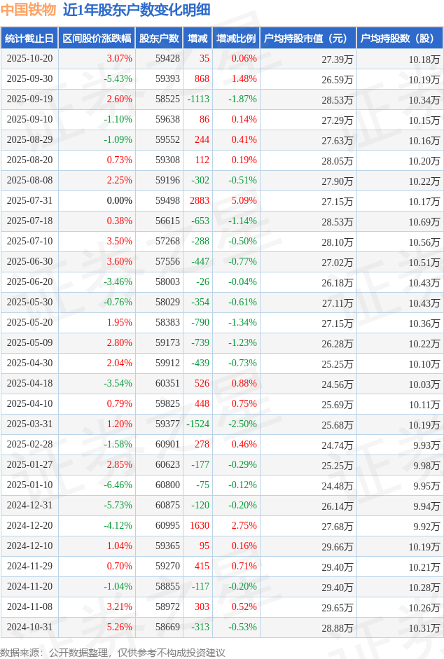 从股价来看,2025年9月30日至2025年10月20日,中国铁物区间涨幅为3.07%,在此期间股东户数增加35.0户,增幅为0.06%。