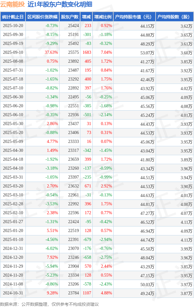 从股价来看,2025年9月30日至2025年10月20日,云南能投区间跌幅为0.73%,在此期间股东户数增加233.0户,增幅为0.92%。