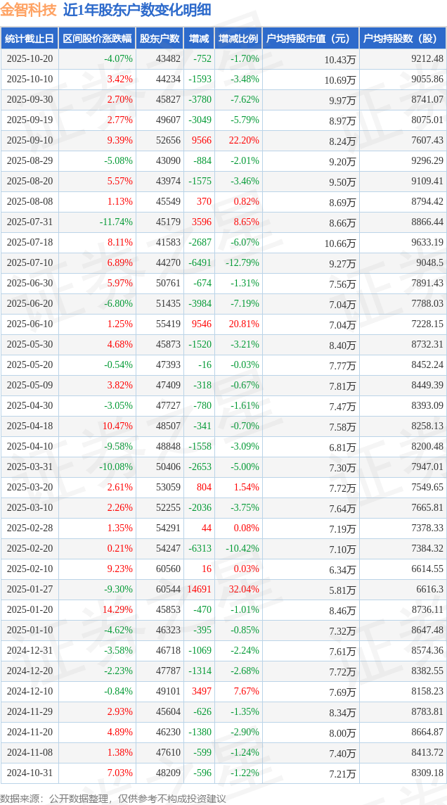 从股价来看,2025年10月10日至2025年10月20日,金智科技区间跌幅为4.07%,在此期间股东户数减少752.0户,减幅为1.7%。