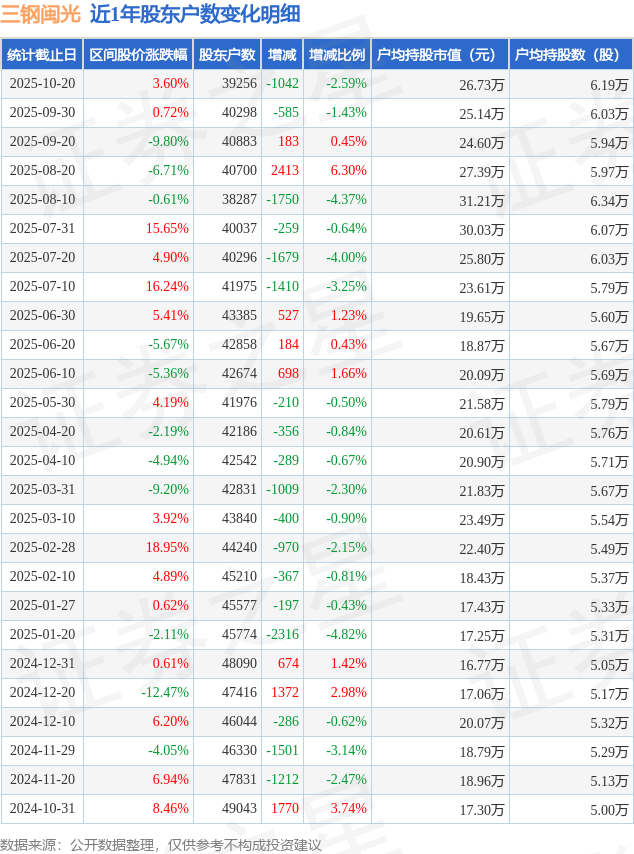 证券之星消息,近日三钢闽光披露,截至2025年10月20日公司股东户数为3.93万户,较9月30日减少1042.0户,减幅为2.59%。户均持股数量由上期的6.03万股增加至6.19万股,户均持股市值为26.73万元。