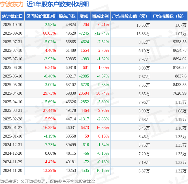 从股价来看,2025年9月30日至2025年10月10日,宁波东力区间跌幅为2.98%,在此期间股东户数增加204.0户,增幅为0.41%。