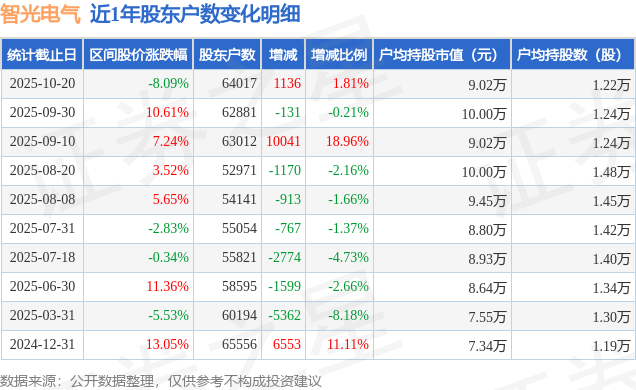 从股价来看,2025年9月30日至2025年10月20日,智光电气区间跌幅为8.09%,在此期间股东户数增加1136.0户,增幅为1.81%。