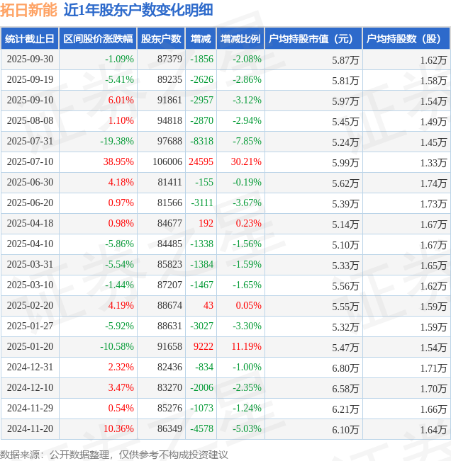 从股价来看,2025年9月19日至2025年9月30日,拓日新能区间跌幅为1.09%,在此期间股东户数减少1856.0户,减幅为2.08%。