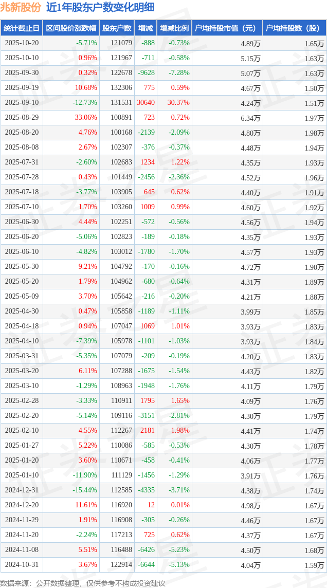 从股价来看,2025年10月10日至2025年10月20日,兆新股份区间跌幅为5.71%,在此期间股东户数减少888.0户,减幅为0.73%。