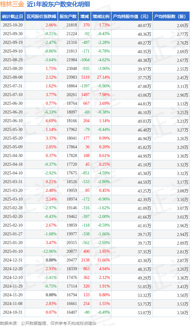 证券之星消息,近日桂林三金披露,截至2025年10月20日公司股东户数为2.18万户,较9月30日增加370.0户,增幅为1.73%。户均持股数量由上期的2.77万股减少至2.69万股,户均持股市值为40.07万元。