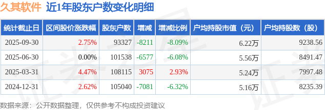 从股价来看,2025年6月30日至2025年9月30日,久其软件区间涨幅为2.75%,在此期间股东户数减少8211.0户,减幅为8.09%。