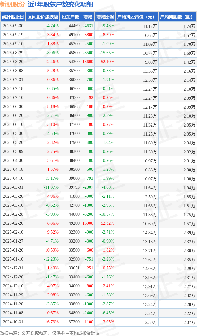从股价来看,2025年9月19日至2025年9月30日,新朋股份区间跌幅为4.74%,在此期间股东户数减少4631.0户,减幅为9.43%。