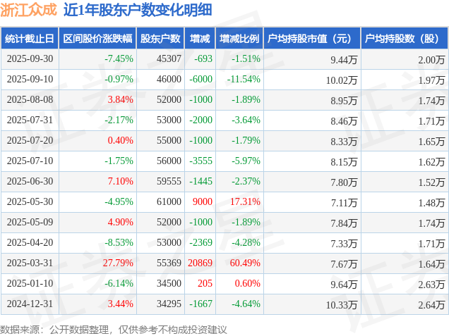 从股价来看,2025年9月19日至2025年9月30日,浙江众成区间跌幅为7.45%,在此期间股东户数减少693.0户,减幅为1.51%。