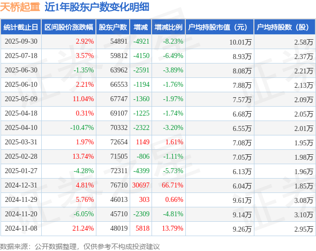 从股价来看,2025年7月18日至2025年9月30日,天桥起重区间涨幅为2.92%,在此期间股东户数减少4921.0户,减幅为8.23%。