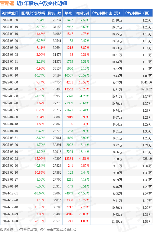 从股价来看,2025年9月19日至2025年9月30日,普路通区间跌幅为2.54%,在此期间股东户数减少1422.0户,减幅为4.56%。