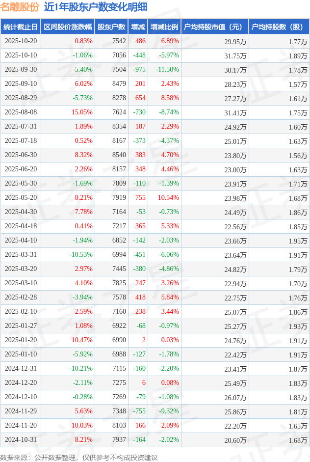 从股价来看,2025年10月10日至2025年10月20日,名雕股份区间涨幅为0.83%,在此期间股东户数增加486.0户,增幅为6.89%。