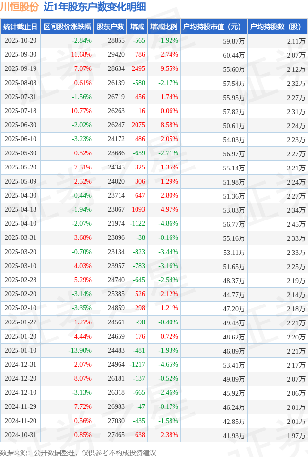 证券之星消息,近日川恒股份披露,截至2025年10月20日公司股东户数为2.89万户,较9月30日减少565.0户,减幅为1.92%。户均持股数量由上期的2.07万股增加至2.11万股,户均持股市值为59.87万元。