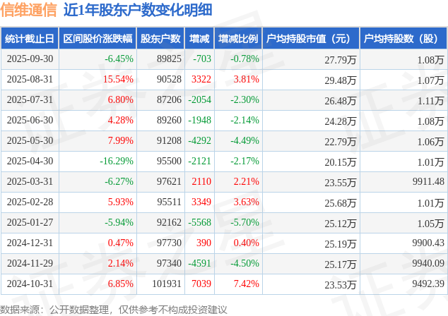 从股价来看,2025年8月31日至2025年9月30日,信维通信区间跌幅为6.45%,在此期间股东户数减少703.0户,减幅为0.78%。