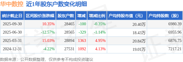 从股价来看,2025年6月30日至2025年9月30日,华中数控区间涨幅为10.35%,在此期间股东户数减少100.0户,减幅为0.35%。