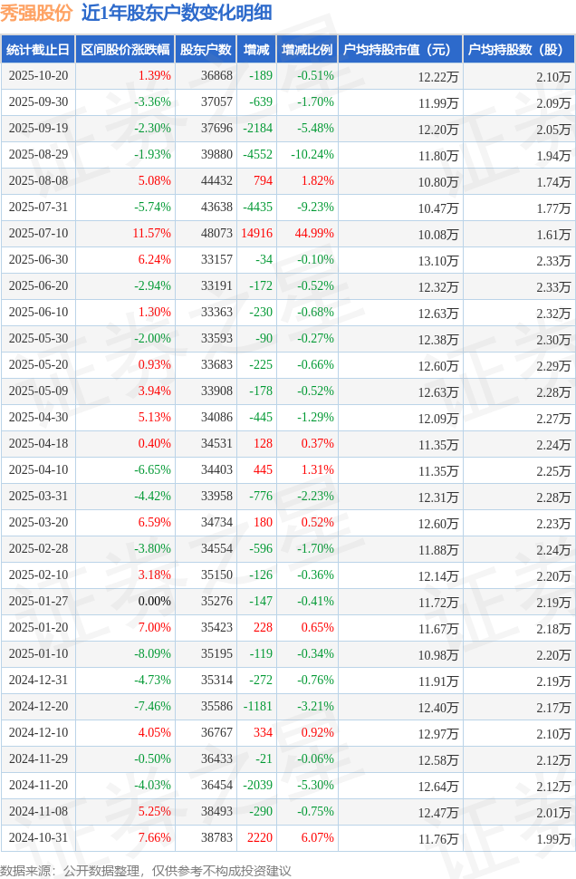 从股价来看,2025年9月30日至2025年10月20日,秀强股份区间涨幅为1.39%,在此期间股东户数减少189.0户,减幅为0.51%。