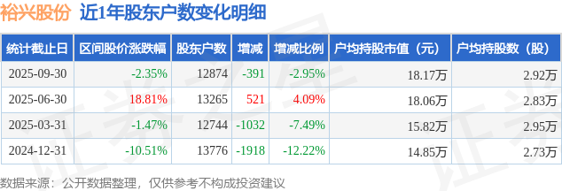 从股价来看,2025年6月30日至2025年9月30日,裕兴股份区间跌幅为2.35%,在此期间股东户数减少391.0户,减幅为2.95%。