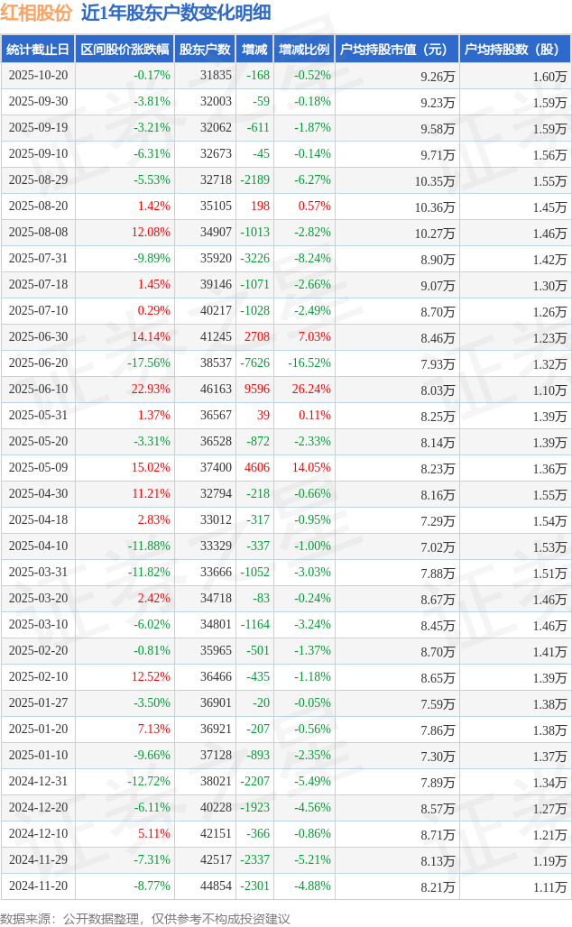 从股价来看,2025年9月30日至2025年10月20日,红相股份区间跌幅为0.17%,在此期间股东户数减少168.0户,减幅为0.52%。
