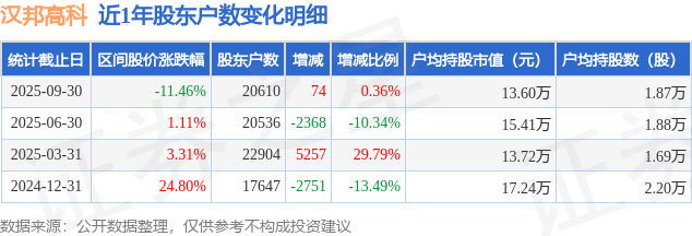 从股价来看,2025年6月30日至2025年9月30日,汉邦高科区间跌幅为11.46%,在此期间股东户数增加74.0户,增幅为0.36%。