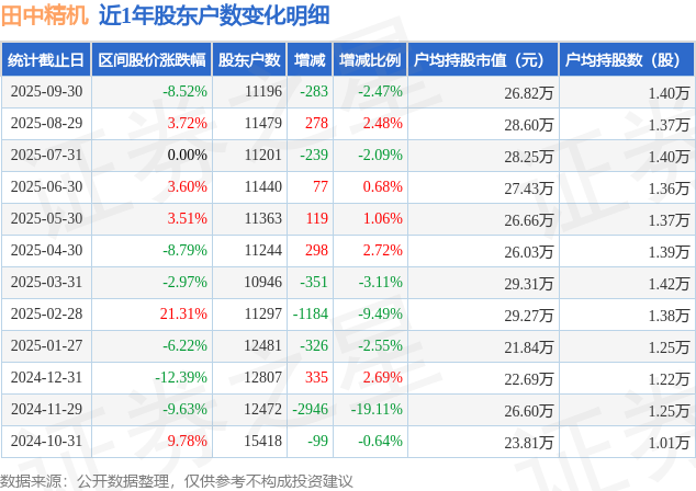 从股价来看,2025年8月29日至2025年9月30日,田中精机区间跌幅为8.52%,在此期间股东户数减少283.0户,减幅为2.47%。