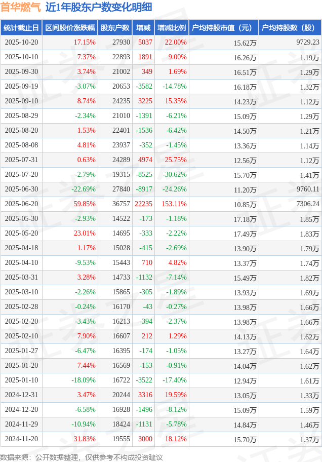 从股价来看,2025年10月10日至2025年10月20日,首华燃气区间涨幅为17.15%,在此期间股东户数增加5037.0户,增幅为22.0%。