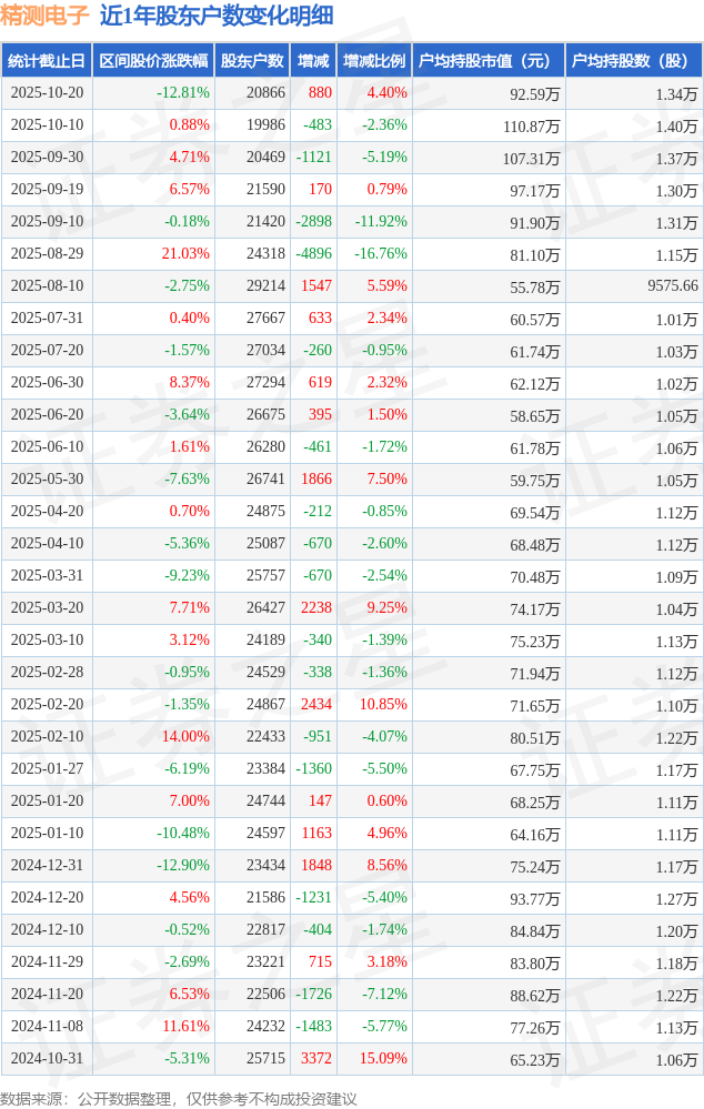 从股价来看,2025年10月10日至2025年10月20日,精测电子区间跌幅为12.81%,在此期间股东户数增加880.0户,增幅为4.4%。