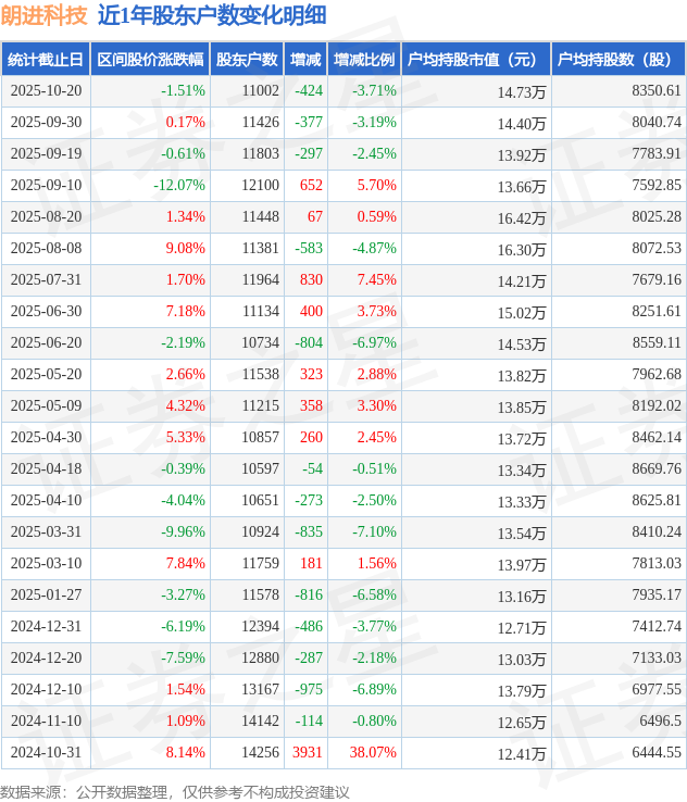 从股价来看,2025年9月30日至2025年10月20日,朗进科技区间跌幅为1.51%,在此期间股东户数减少424.0户,减幅为3.71%。
