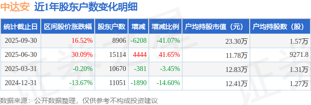 从股价来看,2025年6月30日至2025年9月30日,中达安区间涨幅为16.52%,在此期间股东户数减少6208.0户,减幅为41.07%。
