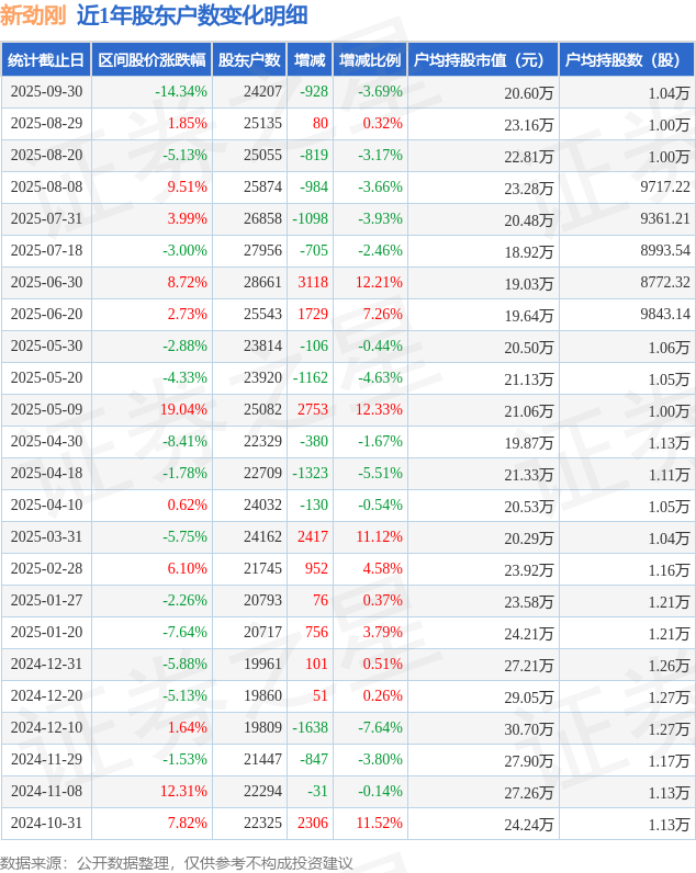 从股价来看,2025年8月29日至2025年9月30日,新劲刚区间跌幅为14.34%,在此期间股东户数减少928.0户,减幅为3.69%。