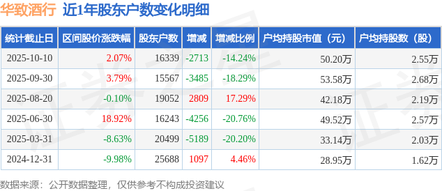 从股价来看,2025年8月20日至2025年10月10日,华致酒行区间涨幅为2.07%,在此期间股东户数减少2713.0户,减幅为14.24%。