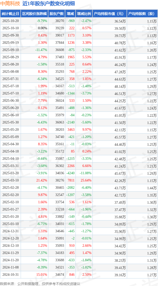 从股价来看,2025年10月10日至2025年10月20日,中简科技区间跌幅为9.79%,在此期间股东户数减少969.0户,减幅为2.47%。