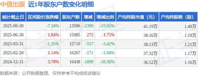 从股价来看,2025年6月30日至2025年9月30日,中信出版区间跌幅为7.34%,在此期间股东户数减少2399.0户,减幅为15.01%。