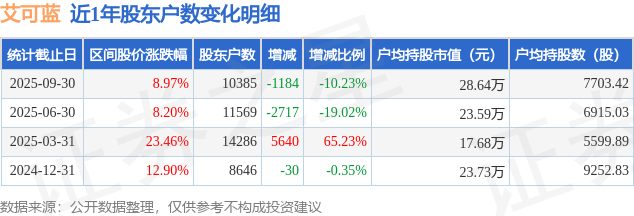 从股价来看,2025年6月30日至2025年9月30日,艾可蓝区间涨幅为8.97%,在此期间股东户数减少1184.0户,减幅为10.23%。