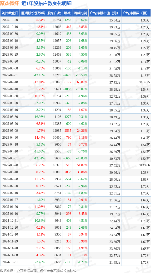 从股价来看,2025年10月10日至2025年10月20日,聚杰微纤区间涨幅为5.54%,在此期间股东户数减少1282.0户,减幅为10.62%。
