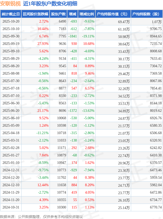 从股价来看,2025年10月10日至2025年10月20日,安联锐视区间涨幅为2.72%,在此期间股东户数减少693.0户,减幅为9.65%。