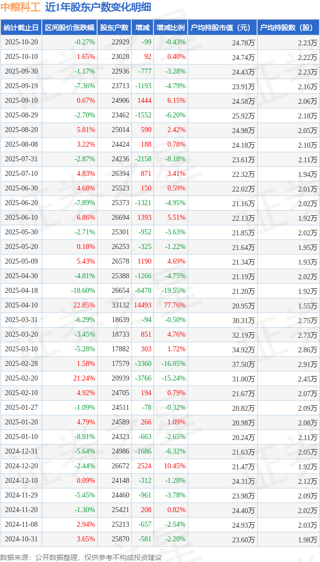 从股价来看,2025年10月10日至2025年10月20日,中粮科工区间跌幅为0.27%,在此期间股东户数减少99.0户,减幅为0.43%。
