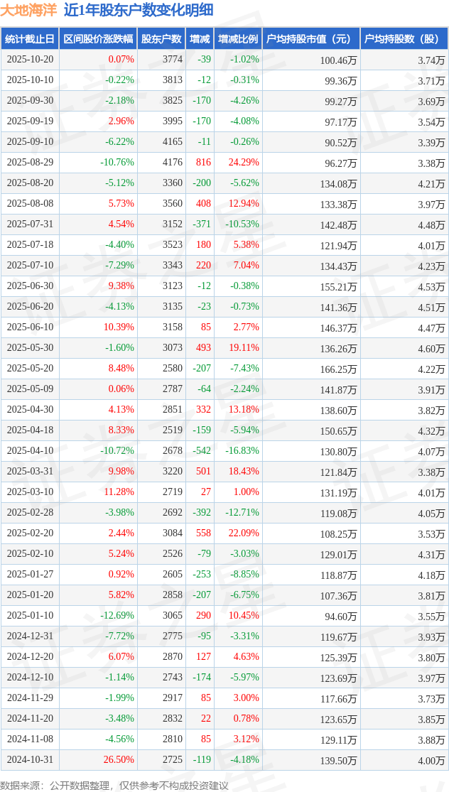 从股价来看,2025年10月10日至2025年10月20日,大地海洋区间涨幅为0.07%,在此期间股东户数减少39.0户,减幅为1.02%。