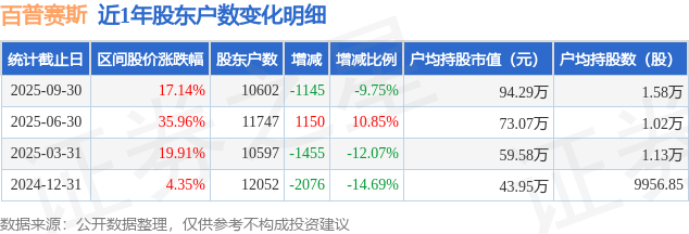 从股价来看,2025年6月30日至2025年9月30日,百普赛斯区间涨幅为17.14%,在此期间股东户数减少1145.0户,减幅为9.75%。