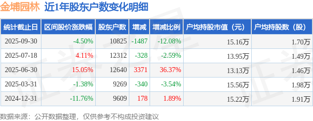 从股价来看,2025年7月18日至2025年9月30日,金埔园林区间跌幅为4.5%,在此期间股东户数减少1487.0户,减幅为12.08%。