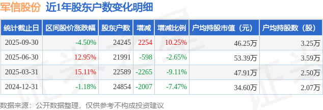 证券之星消息,近日军信股份披露,截至2025年9月30日公司股东户数为2.42万户,较6月30日增加2254.0户,增幅为10.25%。户均持股数量由上期的3.59万股减少至3.25万股,户均持股市值为46.25万元。
