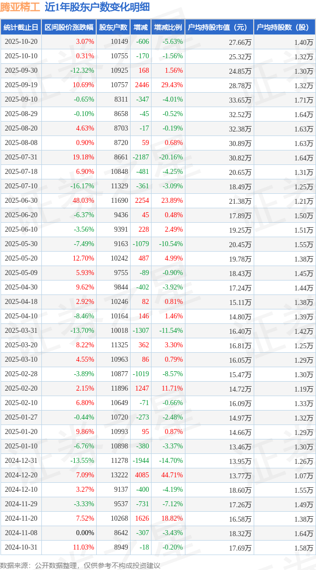 从股价来看,2025年10月10日至2025年10月20日,腾亚精工区间涨幅为3.07%,在此期间股东户数减少606.0户,减幅为5.63%。