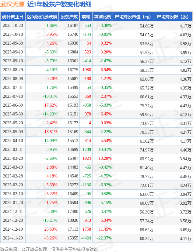 从股价来看,2025年10月10日至2025年10月20日,武汉天源区间跌幅为1.86%,在此期间股东户数减少553.0户,减幅为3.3%。