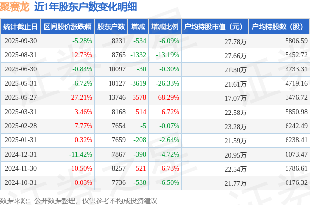 从股价来看,2025年8月31日至2025年9月30日,聚赛龙区间跌幅为5.28%,在此期间股东户数减少534.0户,减幅为6.09%。