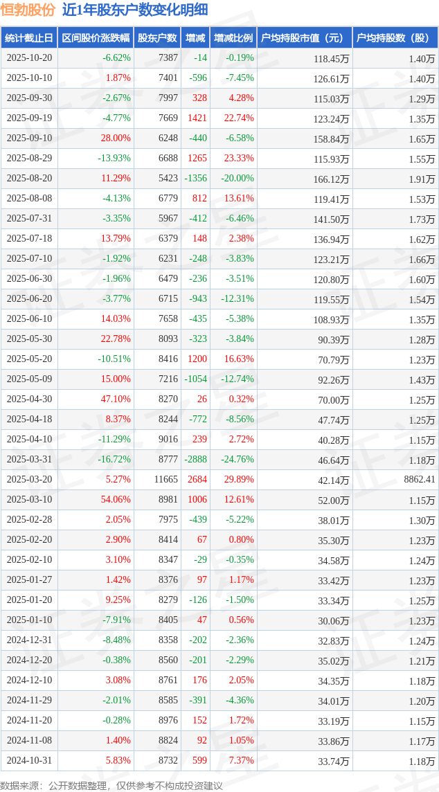 从股价来看,2025年10月10日至2025年10月20日,恒勃股份区间跌幅为6.62%,在此期间股东户数减少14.0户,减幅为0.19%。