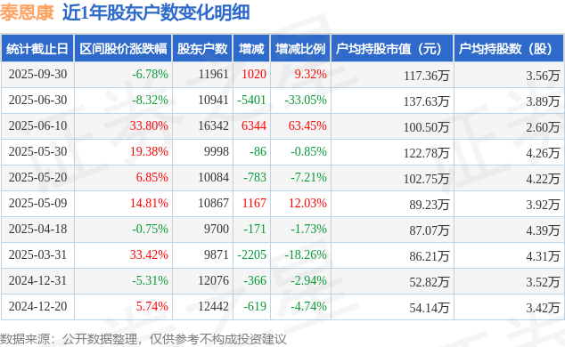 从股价来看,2025年6月30日至2025年9月30日,泰恩康区间跌幅为6.78%,在此期间股东户数增加1020.0户,增幅为9.32%。