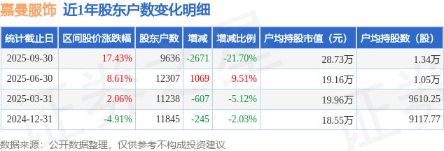 从股价来看,2025年6月30日至2025年9月30日,嘉曼服饰区间涨幅为17.43%,在此期间股东户数减少2671.0户,减幅为21.7%。